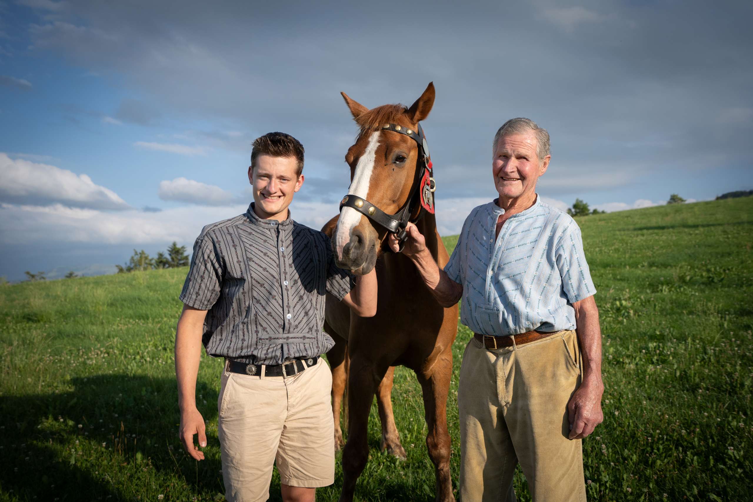 An erhöhter Lage über dem Neckertaler Dorf Oberhelfenschwil liegt idyllisch der Weid-Hof. Hier ist in den 1930er-Jahren Georg, und 71 Jahre später sein Enkel Marc aufgewachsen. Auch heute finden sie sich regelmässig am Tisch der sechsköpfigen Familie zusammen. Geredet wird oft über das, was die beiden verbindet: die Arbeiten auf dem Hof - Grossdädi packt auch mit über 90 Jahren selbstverständlich mit an - und die Arbeit mit den Pferden. Marc hat nämlich einen Beruf gewählt, der zurzeit gerade mal ein Dutzend Lernende zählt: den des Hufschmieds. So bringt er die Leidenschaft zu einem alten Handwerk zurück auf den heute modern gelebten und gepflegten agrotouristischen Familienbetrieb, wo vor Jahrzehnten die Pferde vor den Pflug gespannt wurden, der heute nostalgisch die Scheunenwand ziert, vor der die Restaurant- und Seminargäste staunend innehalten.