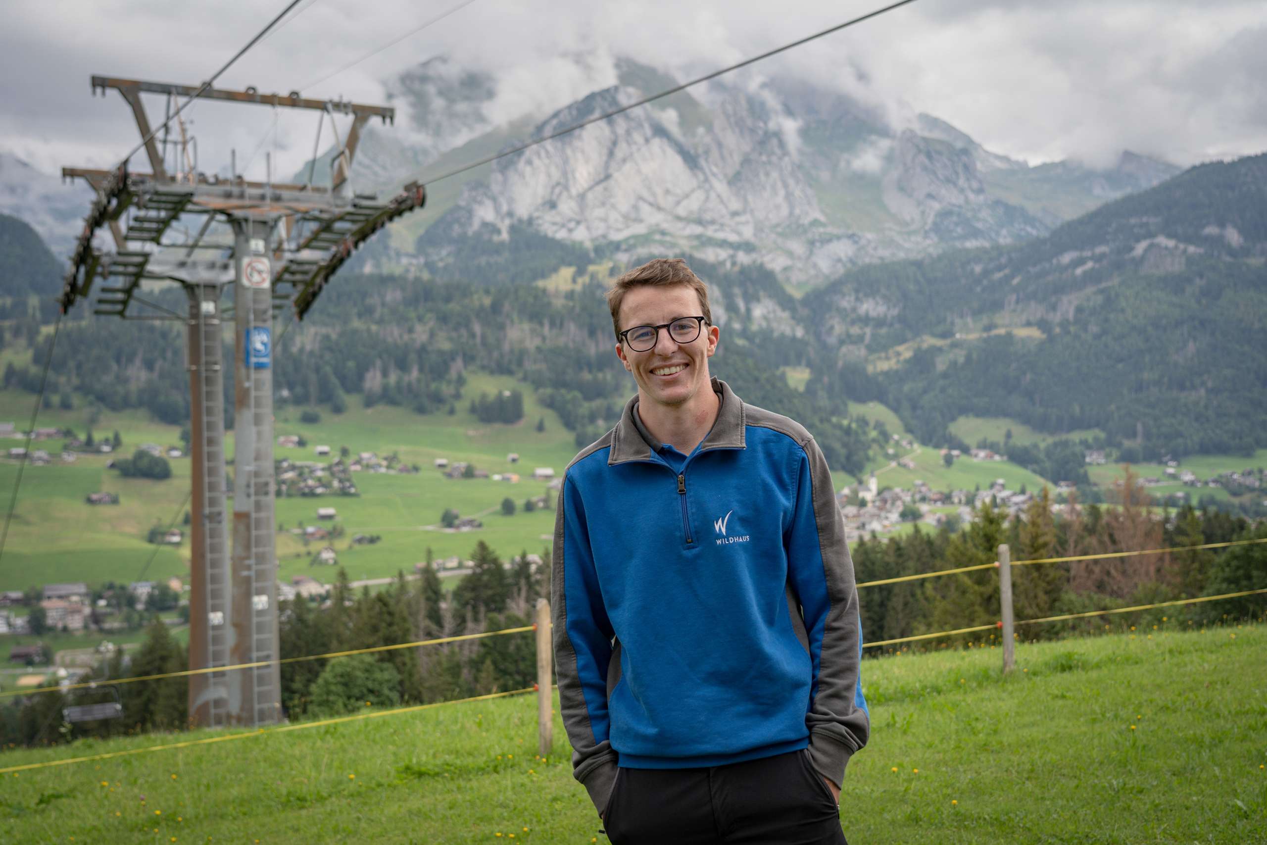 Simon arbeitet ganzjährig bei den Bergbahnen Wildhaus. Das sei hier so speziell erwähnt, weil der Personalbedarf im Sommer wesentlich geringer ist als im Winter, wenn mehr Anlagen beaufsichtigt, die Pisten präpariert und kontrolliert werden und obendrein mehr Gäste vor Ort sind, um deren Wohl sich die Mitarbeitenden kümmern. Simon ist sich den Gästekontakt seit Kindesbeinen gewohnt, ist er doch mit vier Geschwistern in einem Gasthaus aufgewachsen. Sein Herz schlägt sowohl für den Sommer als auch für den Winter. Hauptsache, draussen, denn er kennt kein schlechtes Wetter, bloss schlechte Kleidung. Wenn er nicht die Wander- oder Laufschuhe für die Bewegung in den Bergen schnürt, sind es die Fussballschuhe. Kehrt dann die kalte Jahreszeit ein, ist sein liebstes Fortbewegungmittel der Ski. Sowohl auf der Piste als auch mit Tourenski unterwegs, kennt der Skilehrer vermutlich jedes Bergli und jedes Täli in seiner Heimat in- und auswendig.